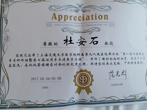 2017年的5月6日-5月8日,三台華廈眼科醫院有限公司淚道病專家杜安石受邀,在忙碌的工作之餘,赴上海,出席上海九院内鏡創傷小手術研修班暨第七屆淚道手術進展學習班并作病例分享。據悉,本次會議(yì)頗具規模。在研修班的開幕式上,中華醫學會眼科分眼整形眼眶病學組組長、上海交通大學黨委副書(shū)記、上海九院眼科學科範先群教授緻歡迎詞,歡迎各位專家、學員(yuán)來到五月的上海,鼓勵各位同侪能在爲時三天的研修班中深入交流、互相(xiàng)學習、有所思考、有所收獲。