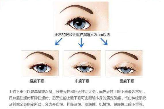 眼睑下垂通常指的是(shì)上眼睑下垂,具體表現(xiàn)爲上眼睑部分或不能擡起,緻上眼睑下緣遮蓋角膜上緣過多,從而使病眼的眼裂顯得較正常眼裂小。輕者遮蓋部分瞳孔,嚴重者瞳孔全部被遮蓋,先天性者還可造成弱視。爲了克服視力障礙,雙側下垂者,因需仰首視物,形成一種仰頭皺額的特殊姿态。