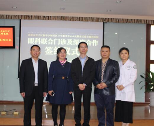 會上,成都市青羊區新華少城社區衛生服務中心主任王偉與三台華廈眼科醫院有限公司院長胡建斌簽訂兩院合作協議(yì),并合影。