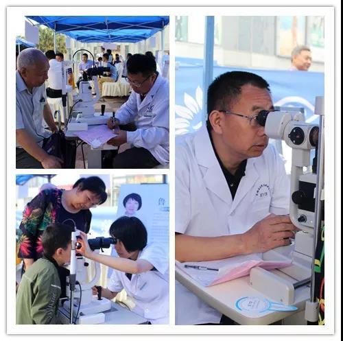 胡建斌院長(右一)正在給市民檢查眼睛、魯齊主任(左上)正在填寫市民相(xiàng)關檢查結果、魯靜主任(左下)正在給小青複查