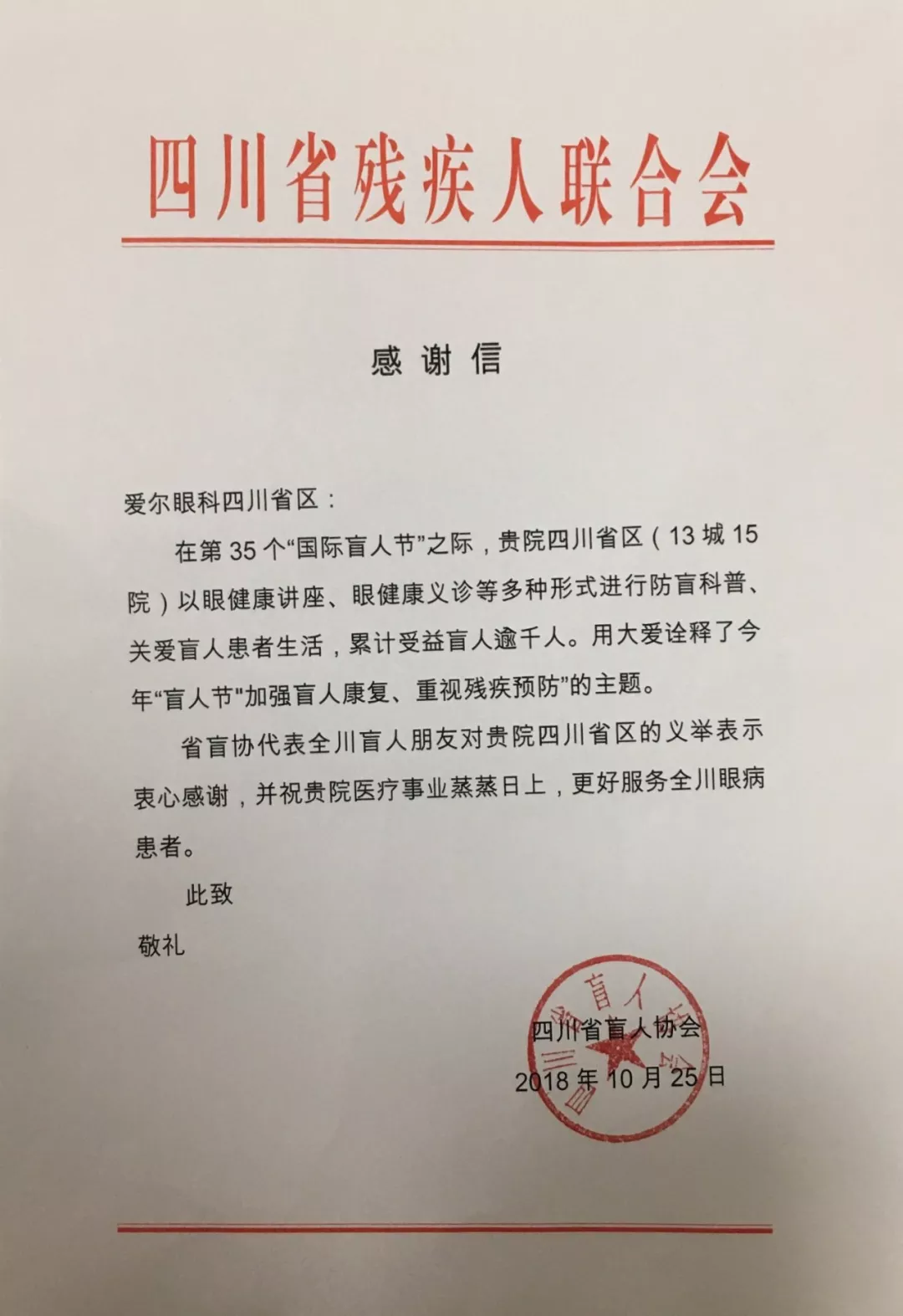 今(25日)下午,四川省盲人協會秘書(shū)長陳封前來送感謝信,三台華廈眼科醫院有限公司事業發展部主任顔珍代爲接收。感謝愛爾眼科四川省區(13城15院:成都東區愛爾、成都愛爾、愛爾眼科·成都康橋、都江堰、綿陽、自貢、南充、西昌、樂山、達州、泸州、宜賓、攀枝花、資陽、内江)在第35個“國際盲人節”之際,以眼健康講座、眼健康義診等多種形式進行防盲科普、關愛盲人生活。
