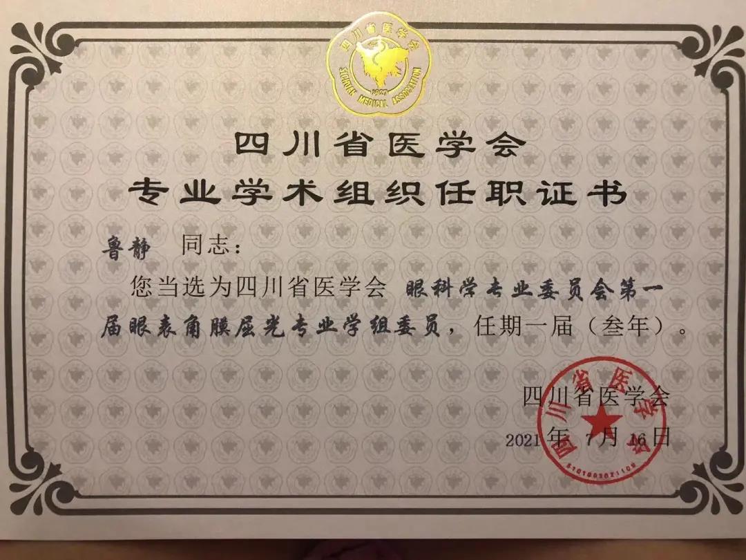 我院眼表角膜科魯靜主任當選省醫學會眼科專業委員(yuán)會首屆眼表角膜屈光專業學組委員(yuán)委員(yuán)!