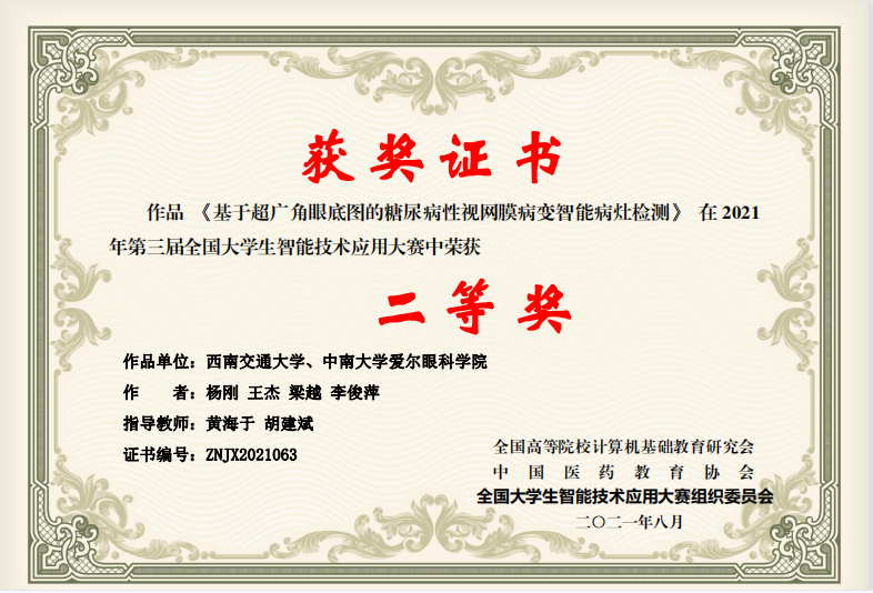 我院與西南交通大學合作參賽作品《基于超廣角眼底圖的糖尿病性視網膜病變智能病竈檢測》入選全國總決賽,最終斬獲二等獎1項,我院胡建斌院長擔任指導教師,王傑、李俊萍醫生參賽。
